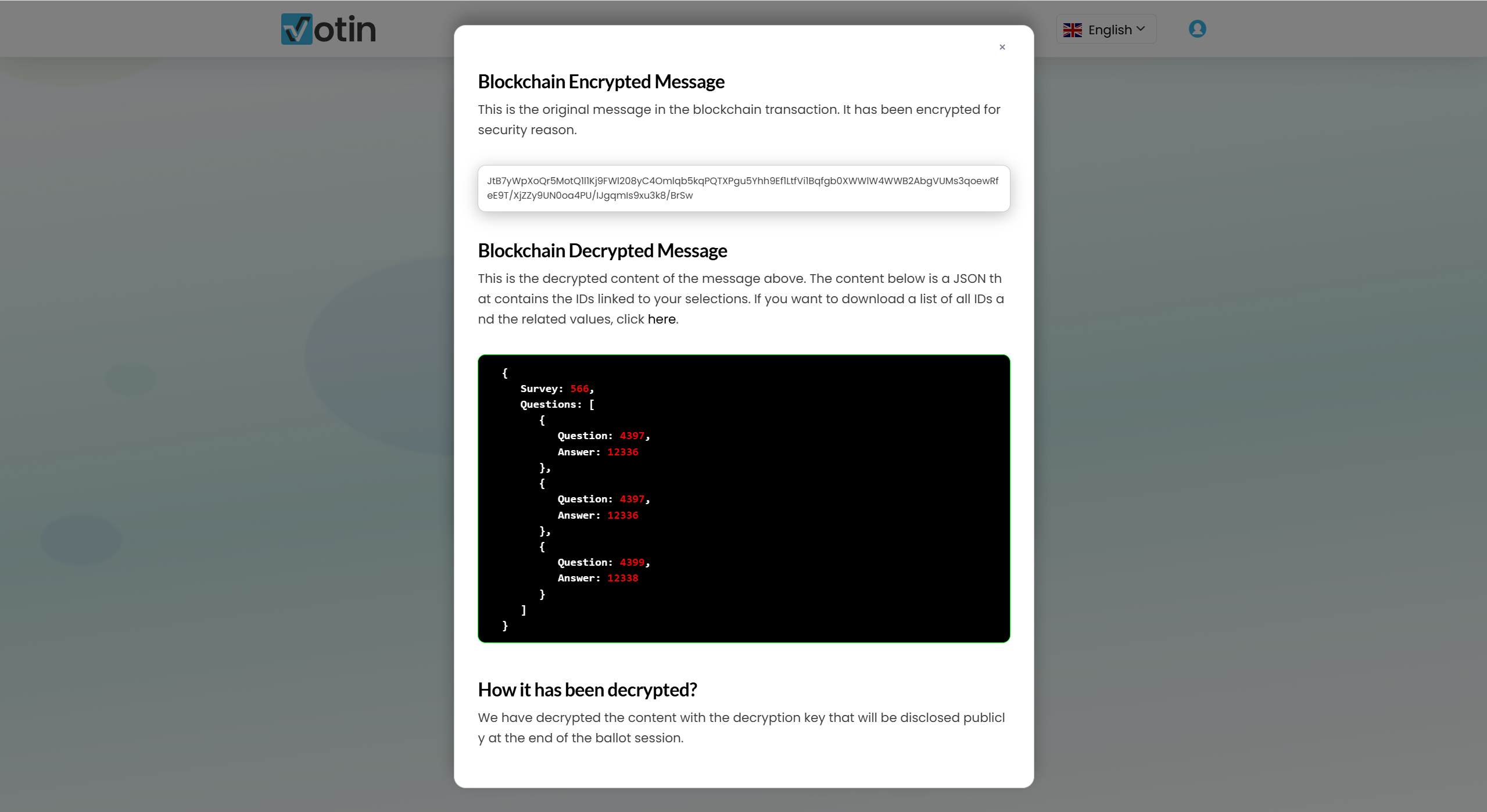 If the ballot administrator has enabled decryption, the option View Decrypted Blockchain Transaction will be available.